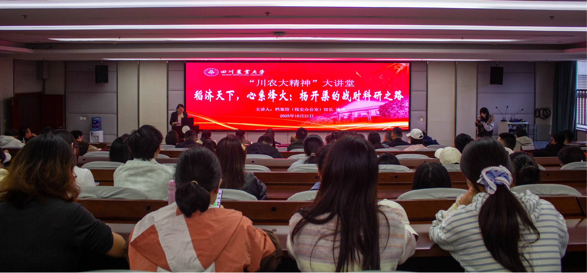 为纪念中国人民抗日战争暨世界反法西斯战争胜利80周年,传承弘扬“川农大精神”,10月21日,由党委宣传部主办的“川农大精神”大讲堂在成都校区举行。四川省方志文化专家库专家、学校档案馆(校史办公室)馆长潘坤教授以“稻济天下,心系烽火——追忆杨开渠教授的抗战科研岁月”为题,介绍了我校杨开渠教授在抗战期间,践行“科技救国”理想信念的感人事迹。我校一院三所作物学科师生代表及档案馆等单位代表百余人现场聆听,共同感悟当代农科人的使命担当。